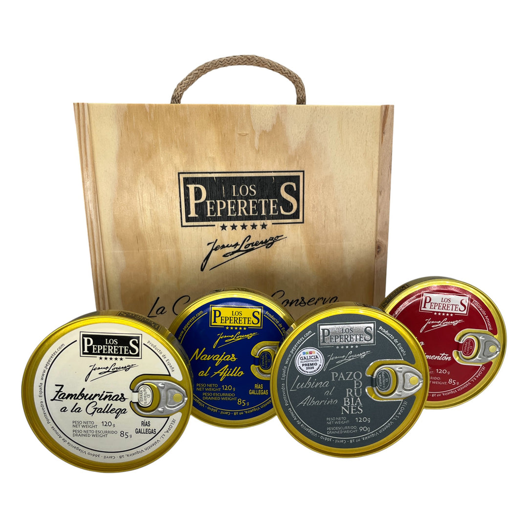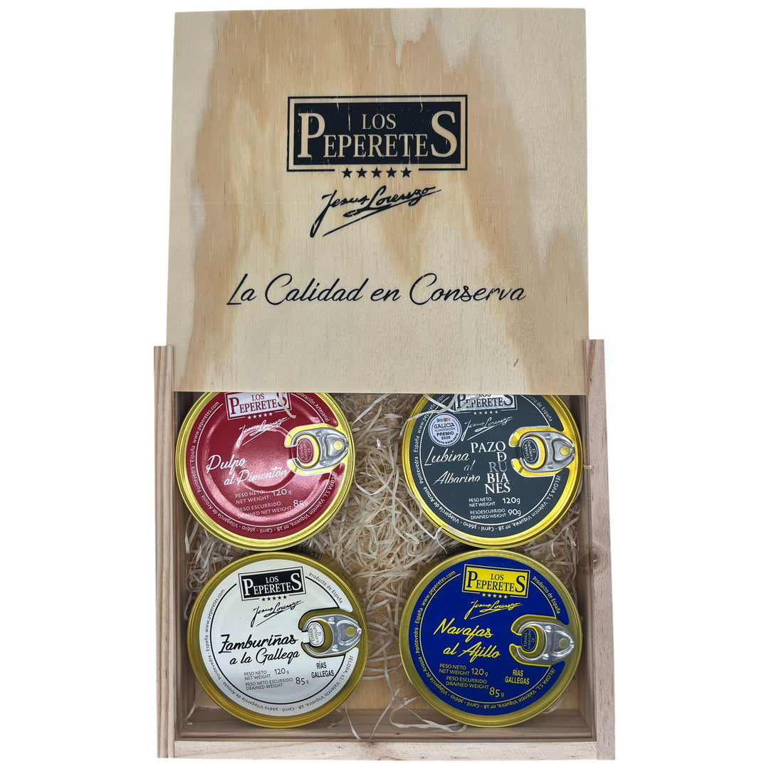 La Caja de Regalo Alalunga Atlantic Delights encarna innovación y técnica, presentando mariscos conservados con la sensibilidad de un chef y el conocimiento de un pescador. Complementándolo, el Giftbox Los Peperetes Sabores Gallegos captura la esencia de Galicia, celebrando los mariscos locales mediante una preparación meticulosa y respeto por el origen.