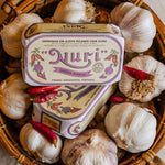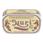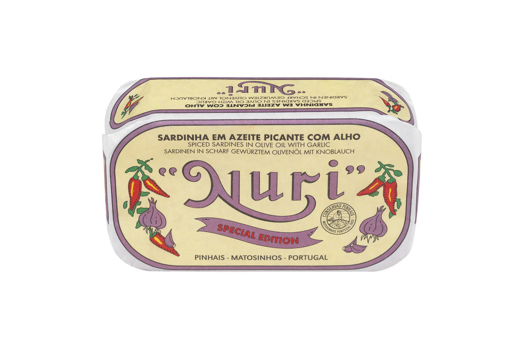 Sardinas portuguesas premium, cuidadosamente conservadas en aceite de oliva especiado con ajo. Una receta sencilla y atemporal que resalta el carácter natural, la textura y el sabor del pescado, fiel a la tradición conservera de NURI.