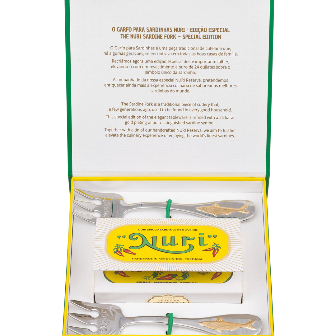 Finished with a luxurious gold coating, this special edition brings timeless elegance to any table. It includes one tin of Spiced Nuri Reserva Sardines in Olive Oil 2021, making it a truly unique gift.